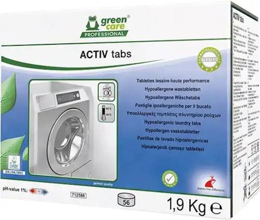 ACTIV tabs bevorderen de veiligheid tijdens het werk en geeft schitterende wasresultaten. Enkel het productbij zijn laagste dosering garandeert reeds schitterende prestaties voor zowel wit als gekleurd linnen.